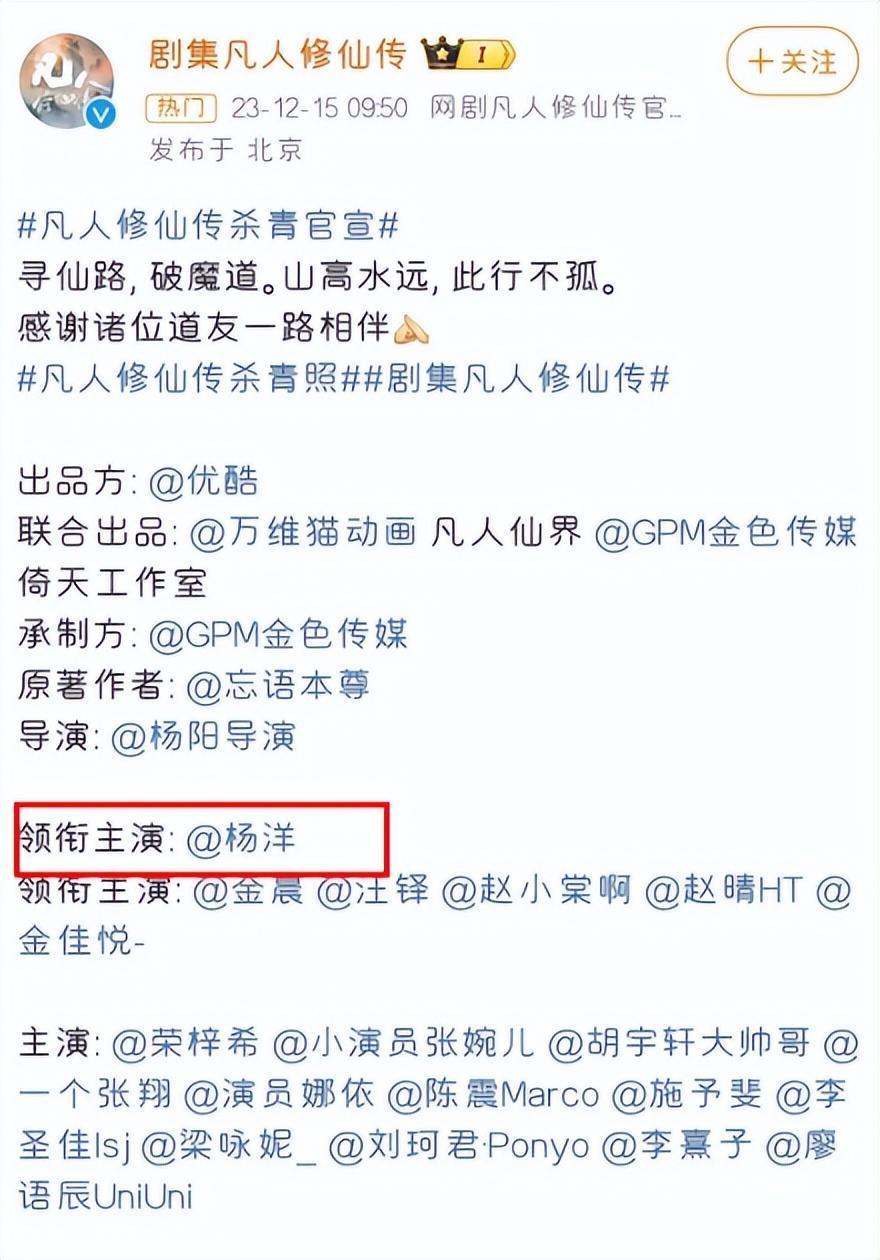 无人不晓,《凡东说念主修仙传》是一部大男主剧,这部剧官宣的时分,官方也将杨洋单独放在一瞥,然后才是其他主演。