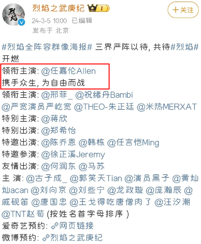 这部剧官宣主演威望的时分,也引起很大的温雅,当大部分剧皆在用“逗号”粗略隔一瞥的时分,这部剧平直将任嘉伦的名字放在前边,然后后头加一句“联袂众生,为解放而战”,然后才是其他领衔主演。